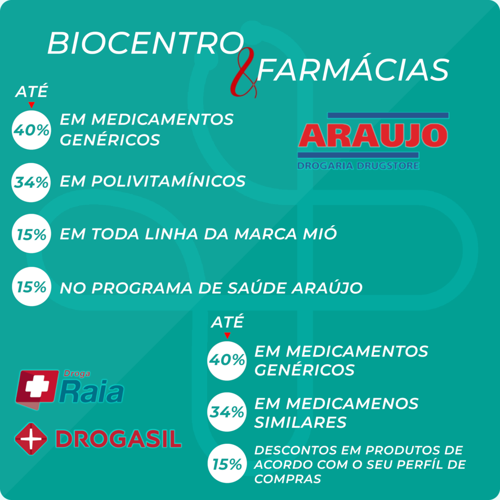 Nesta parceria você e sua família já podem aproveitar até 70% de desconto em consultas, exames e até 40% em medicamentos com o seu Cartão Biocentro.